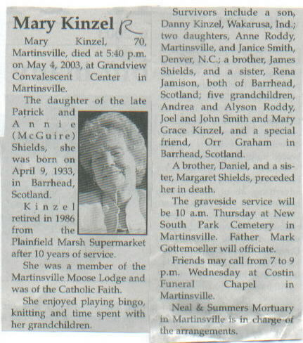 Survived By Son, Danny Kinzel; 2 daughters, Anne Roddy and Janice Smith; brother, James Shields; sister, Rena Jamison; 5 grandchildren, Andrea and Alyson Roddy, Joel and John Smith, and Mary Grace Kinzel; special friend, Orr Graham in Barrhead, Scotland.