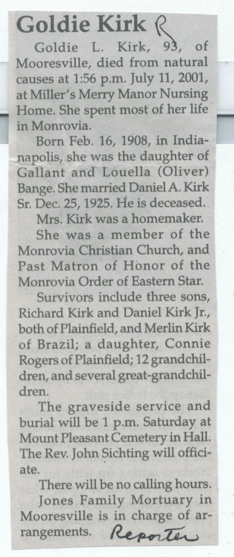 Survived By Sons, Richard Kirk, Merlin Kirk, and Daniel Kirk, Jr.; daughter, Connie Rogers; 12 grandchildren; several great-grandchildren.