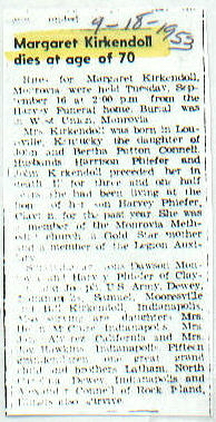| Survived By | Sons, Dawson and Harvey Pheiffer, and Joseph, Dewey, Sam, and Bill Kirkendoll; daughters, Mrs. Helen McClure, Mrs. Jane Alverez, and Mrs. Joy Hawkins; brothers, Latham, Dewey, and Alexander Connell. |
