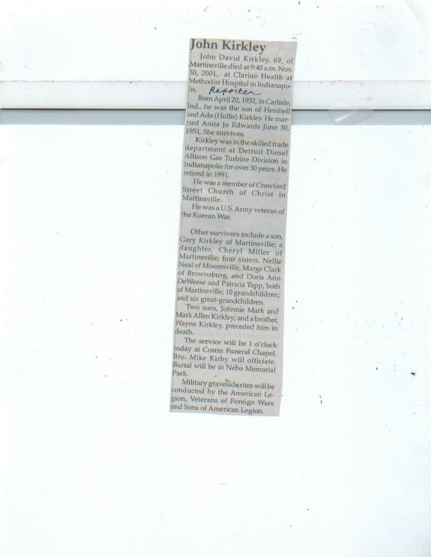| Other | Preceded in death by parents, Hershell and Ada (Hollis) Kirkley; sons, Johnnie Mark and Mark Allen Kirkley; brother, Wayne Kirkley. U.S. Army veteran of the Korean War. |