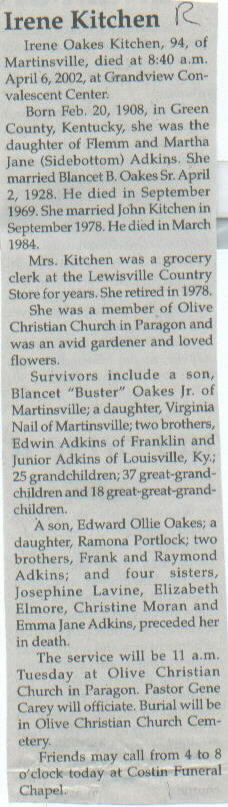 Survived By Son, Blancet "Buster" Oakes, Jr.; daughter, Virginia Nail; 2 brothers, Edwin and Junior Adkins; 25 grandchildren; 37 great-grandchildren; 18 great-great-grandchildren.
