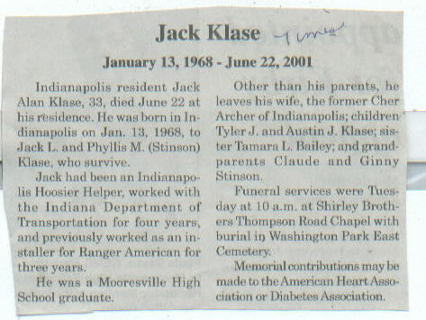 | Survived By | Spouse; parents, Jack L. and Phyllis M. (Stinson) Klase; children, Tyler J. and Austin J. Klase; sister, Tamara L. Bailey; grandparents. |