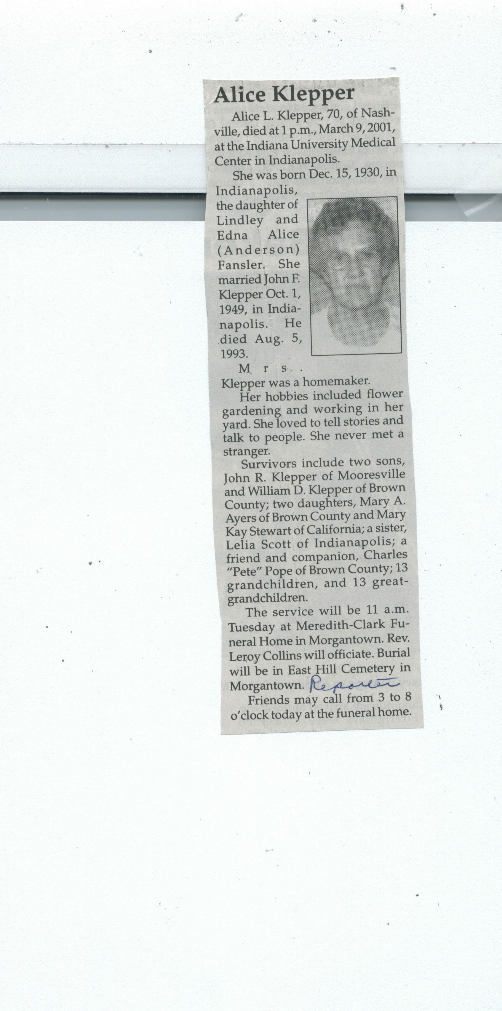 Survived By Sons, John R. and William D. Klepper; daughters, Mary A. Ayers and Mary Kay Stewart; sister, Lelia Scott; 13 grandchildren; 13 great-grandchildren.