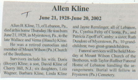 Survived By Widow; son, David Kline; 6 daughters, Lois Wagner, Barbara Kline, Linda Kline, Jayne Remlinger, Cynthia Felty, and Patricia Zipoff; sister, Ruth Dundore; 10 grandchildren; 2 great-grandchildren.