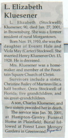 Other Preceded in death by spouse; parents, Everett Hale and Viola May (Carter) Stockwell; son, Charles Kluesener; 2 sisters.