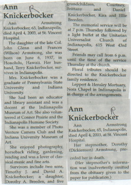 | Other | Daughter of the late Col. John Glenn and Frances (Wilson) Armstrong. Her stepmother, Dorothy (Dickenson) Armstrong, preceded her in death. |