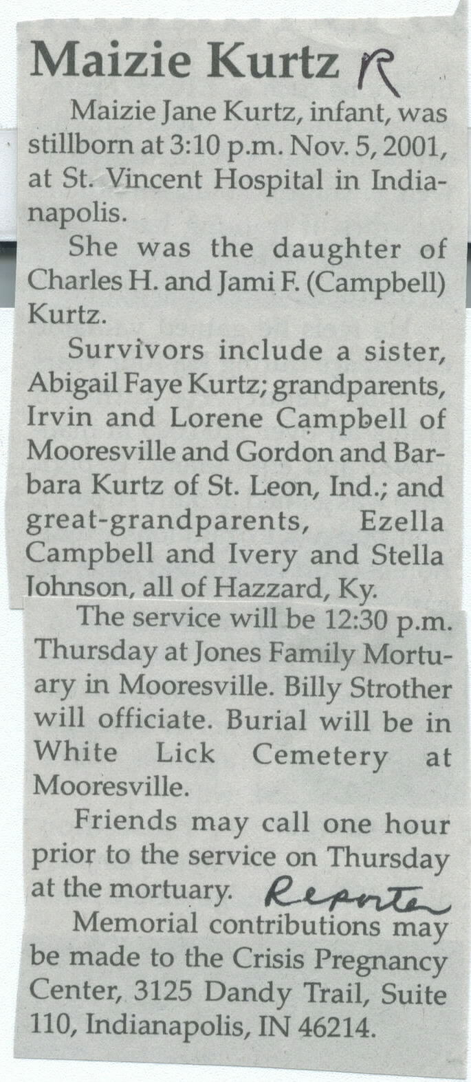 Survived By Parents, Charles H. and Jami F. (Campbell) Kurtz; sister, Abigail Faye Kurtz; grandparents and great-grandparents.