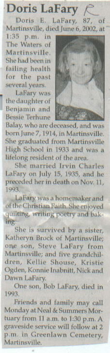 | Survived By | Sister, Katheryn Brock; son, Steve LaFary; 5 grandchildren, Kellie Shouse, Kristie Ogden, Konnie Inabnitt, Nick and Dawn LaFary. |
