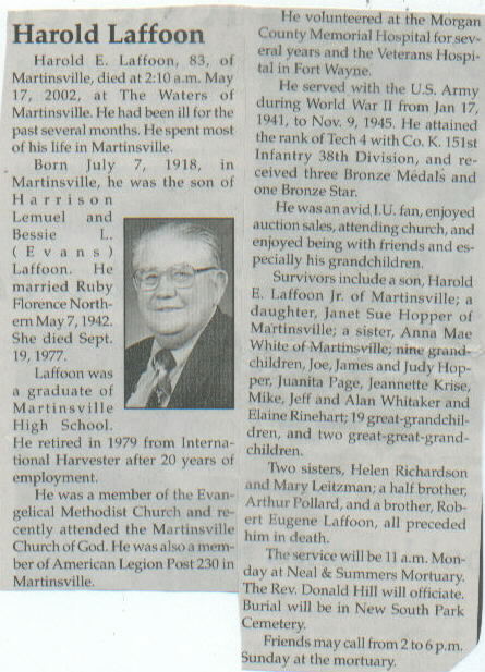 | Survived By | Son, Harold E. Laffoon, Jr.; daughter, Janet Sue Hopper; sister, Anna Mae White; 9 grandchildren, Joe, James and Judy Hopper, Juanita Page, Jeannette Krise, Mike, Jeff, and Alan Whitaker, and Elaine Rinehart; 19 great-grandchildren; 2 great-great-grandchildren. |