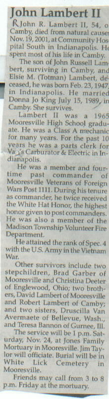 Survived By Spouse; father, John Russell Lambert; brothers, David and Robert Lambert; sisters, Druscilla Van Avermaete and Teresa Bannon; stepchildren, Brad Garber and Christina Deeter.