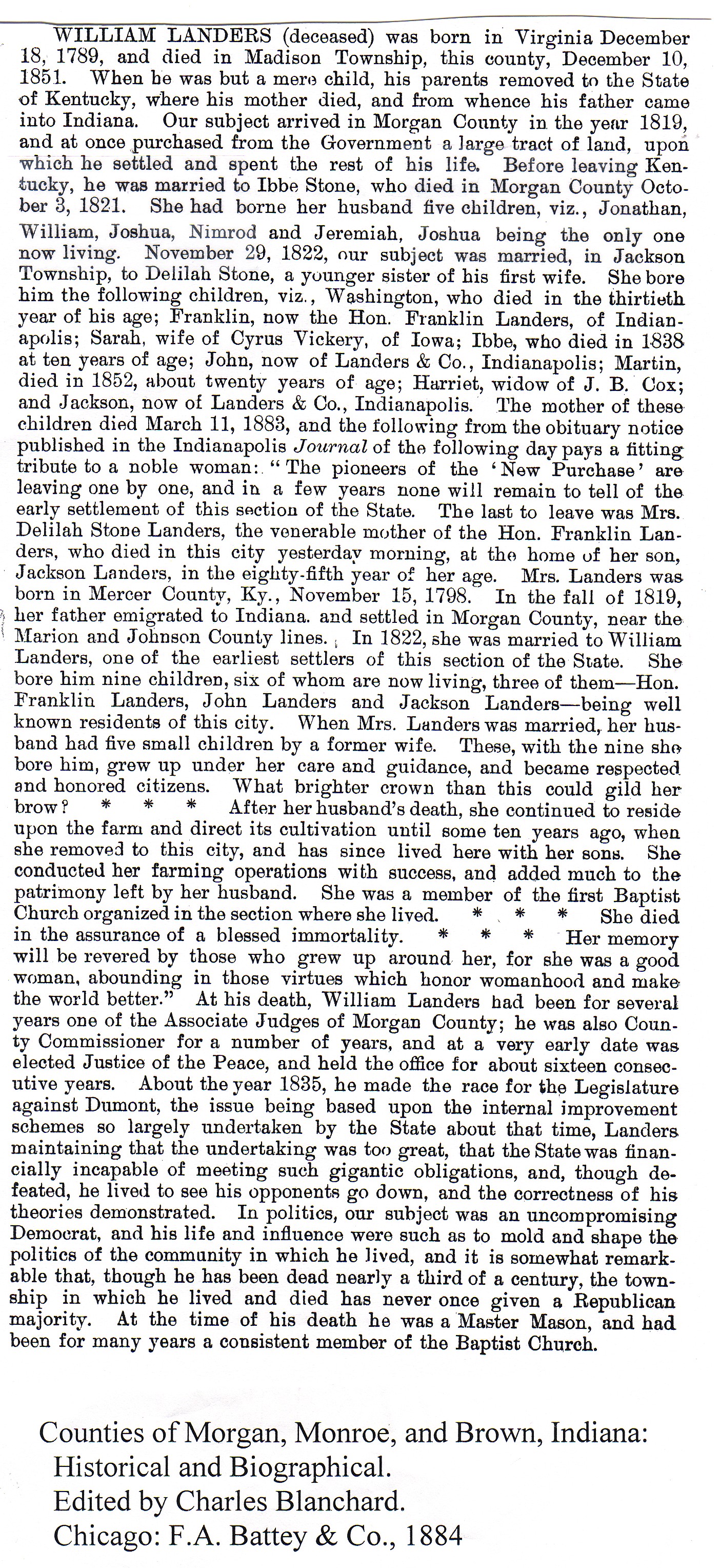 Other Age 61 years, 9 months, and 22 days. Born Dec. 18, 1789 in Fauquier Co., Va.; son of Jonathan and Susannah Landers. Married Ibbe Stone in Mercer Co., Kentucky; they had five sons: Jonathan, William, Nimrod, Jeremiah, and Joshua. Ibbe died Nov. 29, 1821, and on November 29, 1822 William married her sister, Delilah. They had eight children: Washington, Franklin, Sarah (Vickey) Ibby, John, Martin, Henry, Harriet, and Jackson. [Cemetery is on Mann Road near Waverly, Ind. (Lugar farm.)]