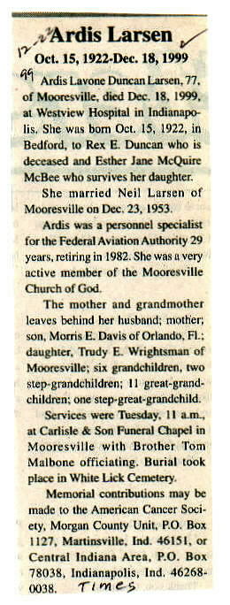 | Obituary Source | Mooresville Times, Dec. 22, 1999 |