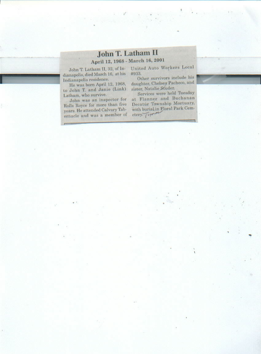 | Survived By | Parents, John T. and Janie (Link) Latham; daughter, Chelsea Pacheco; sister, Natalie Studer. |
