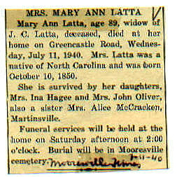 | Obituary Source | Mooresville Times, July 11, 1940 |