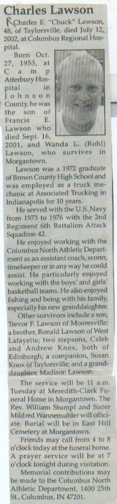 | Survived By | Mother, Wanda L. (Rohl) Lawson; son, Trevor F. Lawson; brother, Ronald Lawson; 2 stepsons, Caleb and Andrew Know; companion, Susan Knox; granddaughter, Madison Lawson. |