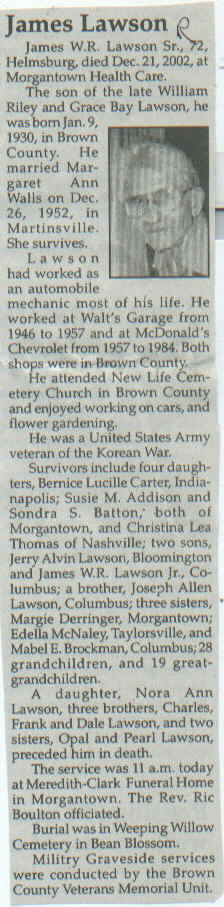 | Survived By | Widow; 4 daughters, Bernice Lucille Carter, Susie M. Addison, Sondra S. Batton, and Christina Lea Thomas; 2 sons, Jerry Alvin and James W. R. Lawson, Jr.; brother, Joseph Allen Lawson; 3 sisters, Margie Derringer, Edella McNaley, and Mabel E. Brodkman; 28 grandchildren; 19 great-grandchildren. |