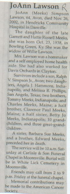 Survived By Son, Ralph V. Simpson, Jr.; 2 daughters, Angela J. Hammons and Melissa R. Phillips; 2 brothers, Tommy and Charles Meeks; half brother, Clarence Paul Meeks; half sister, Betty Jo Meeks; 10 grandchildren; 3 great-grandchildren.