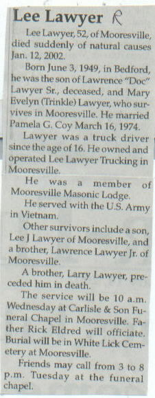| Survived By | Widow; mother, Mary Evelyn (Trinkle) Lawyer; son, Lee J. Lawyer; brother, Lawrence Lawyer, Jr. |