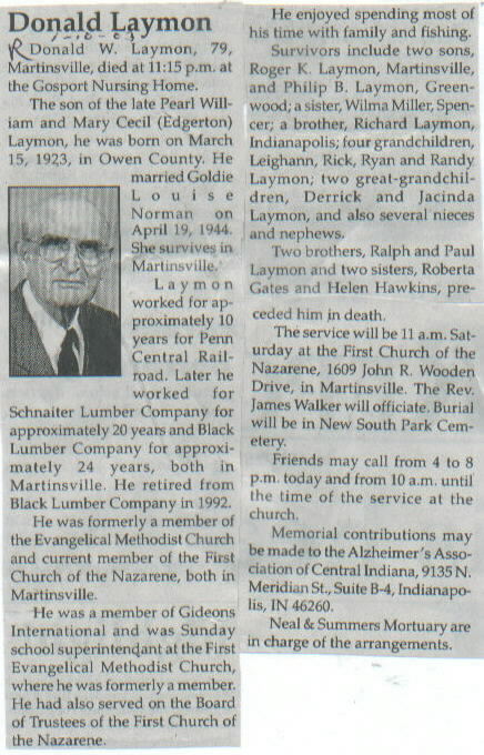 | Other | Age 79. Two brothers, Ralph and Paul Laymon and two sisters, Roberta Gates and Helen Hawkins, preceded him in death. Son of the late Pearl William and Mary Cecil (Edgerton) Laymon. |