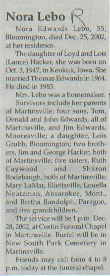 | Survived By | Parents, Lloyd and Lois (Lance) Hacker; 4 sons, Tom, Donald, John, and Jim Edwards; daughter, Lois Grubb; 2 brothers, Jim and George Hacker; 5 sisters, Ruth Caywood, Sharon Rodebaugh, Mary LaMar, Louella Neutzman, and Bertha Randolph; 5 grandchildren. |