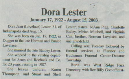Survived By Children, Karen Thompson, and Stuart and Shell Lester; sisters, JoAnn Pigg, Charlotte Bailey, Miriam Mitchell, and Virginia Catt; brother, Norman Lovelace; one grandchild.