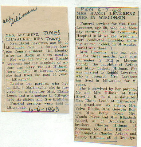 | Survived By | Parents, Arthur and Mary Tackett Hillman; daughter, Mrs. Elaine Leech; sisters, Velva Riddle, Georgia Burton, Betty Crowe, Wanda Payne, and Elizabeth Record; brothers, Chester, John H., Charles, Arthur, and Barney Hillman. |