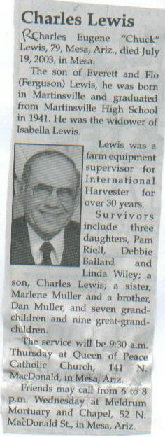 Survived By Three daughters, Pam Riell, Debbie Ballard, and Linda Wiley; son, Charles Lewis; sister, Marlene Muller; brother, Dan Muller; 7 grandchildren; 9 great-grandchildren.