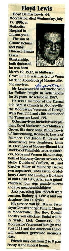 | Survived By | Wife; sons, Randy, Ronnie, and Jason D. Lewis; daughters, Linda M. Clevenger and Lila M. Maddox; sisters, Melba Durbin and Carolyn Miller. |