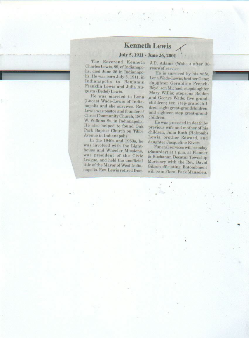 Other Preceded in death by parents, Benjamin Franklin and Julia Augusta (Bedel) Lewis; previous wife, Julia Ruth (Holcomb) Lewis; brother, Edward Lewis; daughter, Jacqueline Kivett.
