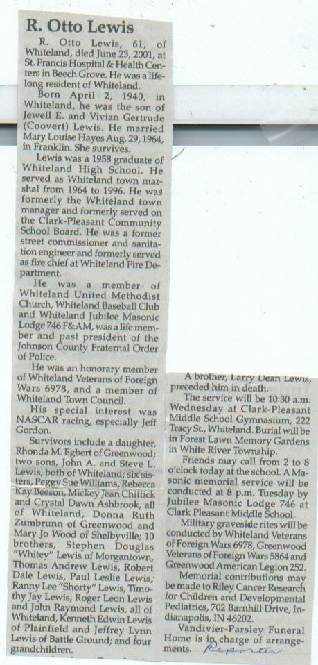 Survived By Spouse; daughter, Rhonda M. Egbert; sons, John A. and Steve L. Lewis; sisters, Peggy Sue Williams, Rebecca Kay Beeson, Mickey Jean Chittick, Crystal Dawn Ashbrook, Donna Ruth Zumbrunn, and Mary Jo Wood; brothers, Stephen Douglas, Thomas Andrew, Robert Dale, Paul Leslie, Ranny Lee, Timothy Jay, Robert Leon, John Raymond, Kenneth Edwin, and Jeffrey Lynn Lewis; 4 grandchildren.