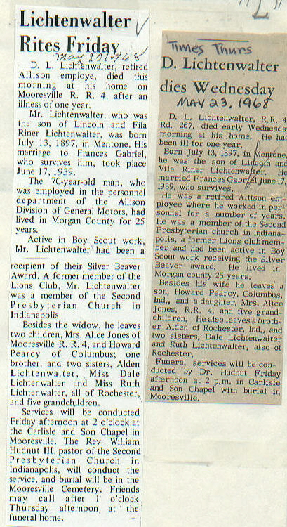 | Survived By | Wife; son, Howard Pearcy; daughter, Mrs. Robert (Alice) Jones; brother, Alden Lichtenwalter; sisters, Dale and Ruth Lichtenwalter. |