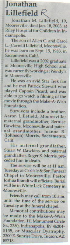 | Survived By | Parents, Allen C. and Carol L. (Correll) Lillefield; brother, Aaron Lillefield; maternal grandmother, Bernice Dawkins; paternal grandmother, Joanne R. (Johnson) Morris. |