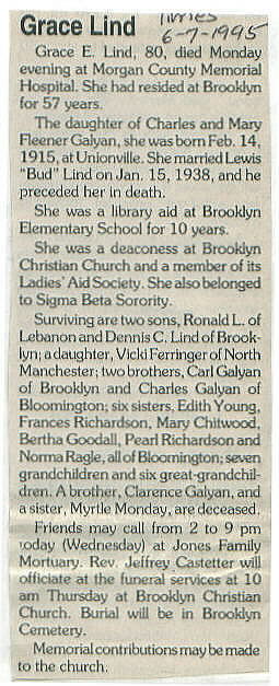 Survived By Sons, Ronald L. and Dennis C. Lind; daughter, Vicki Ferringer; brothers, Carl and Charles Galyan; sisters, Edith Young, Frances Richardson, Mary Chitwood, Bertha Goodall, Pearl Richardson, and Norma Ragle.