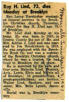 | Survived By | Wife; sons, Malcolm, Lewis, Elvin, and Melvin Lind; brother, Walter Lind; sister, Mrs. Belle Lunch. |
