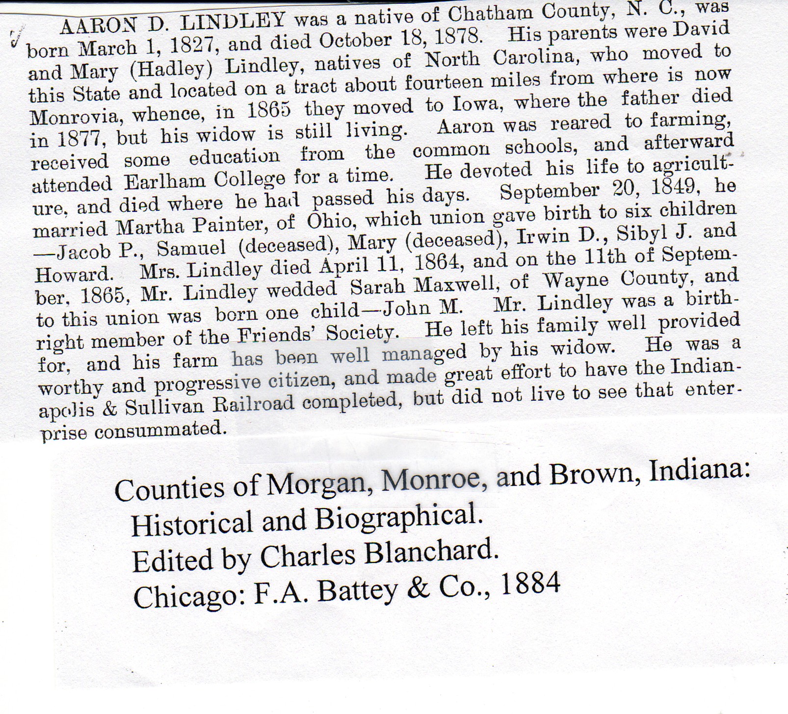 | Other | Age 51 years, 7 months and 17 days. Parents: David and Mary (Hadley) Lindley. Married first wife on Sept. 20, 1849; they had 6 children: Jacob P., Samuel, Mary, Irwin D., Sibyl J., and Howard. Wife died April 11, 1864; married second wife on Sept. 10, 1865 in Wayne Co. They had one child, John M. |