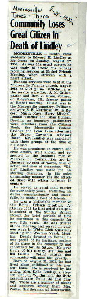 | Obituary Source | Mooresville Times, Aug. 21, 1952 |
