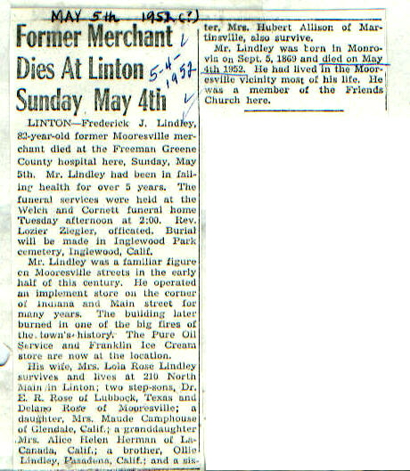 | Survived By | Wife, Lola Rose; daughter, Mrs. Maude Camphouse; brother, Ollie Lindley; sister, Mrs. Hubert Allison. |