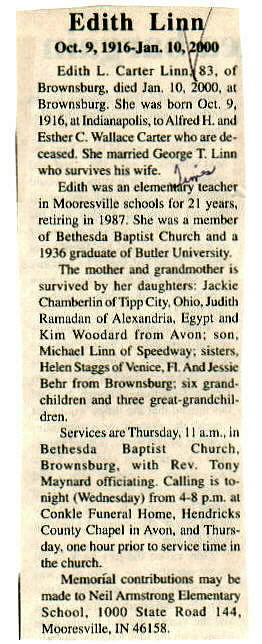 Other Age 83. Conkle Funeral Home, Avon. Service at Bethesda Baptist Church, Brownsburg. Parents: Alfred H. and Esther C. Wallace Carter. Elementary school teacher in the Mooresville schools for 21 years. Retired 1987.