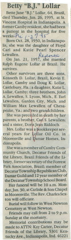 | Survived By | Husband; sons, Kenneth D., Kevin E., and Doug K. Lollar; daughter, Katie L. Lollar. |