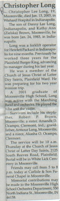 Survived By Parents, Danny Lee Long of Indianapolis and Kathy Ann (Zielska) Brown of Mooresville; stepfather, Robert P. Brown; sister, Amanda D. Ocampo; grandfather, Armour Long; niece, Akasha O. Ocampo.