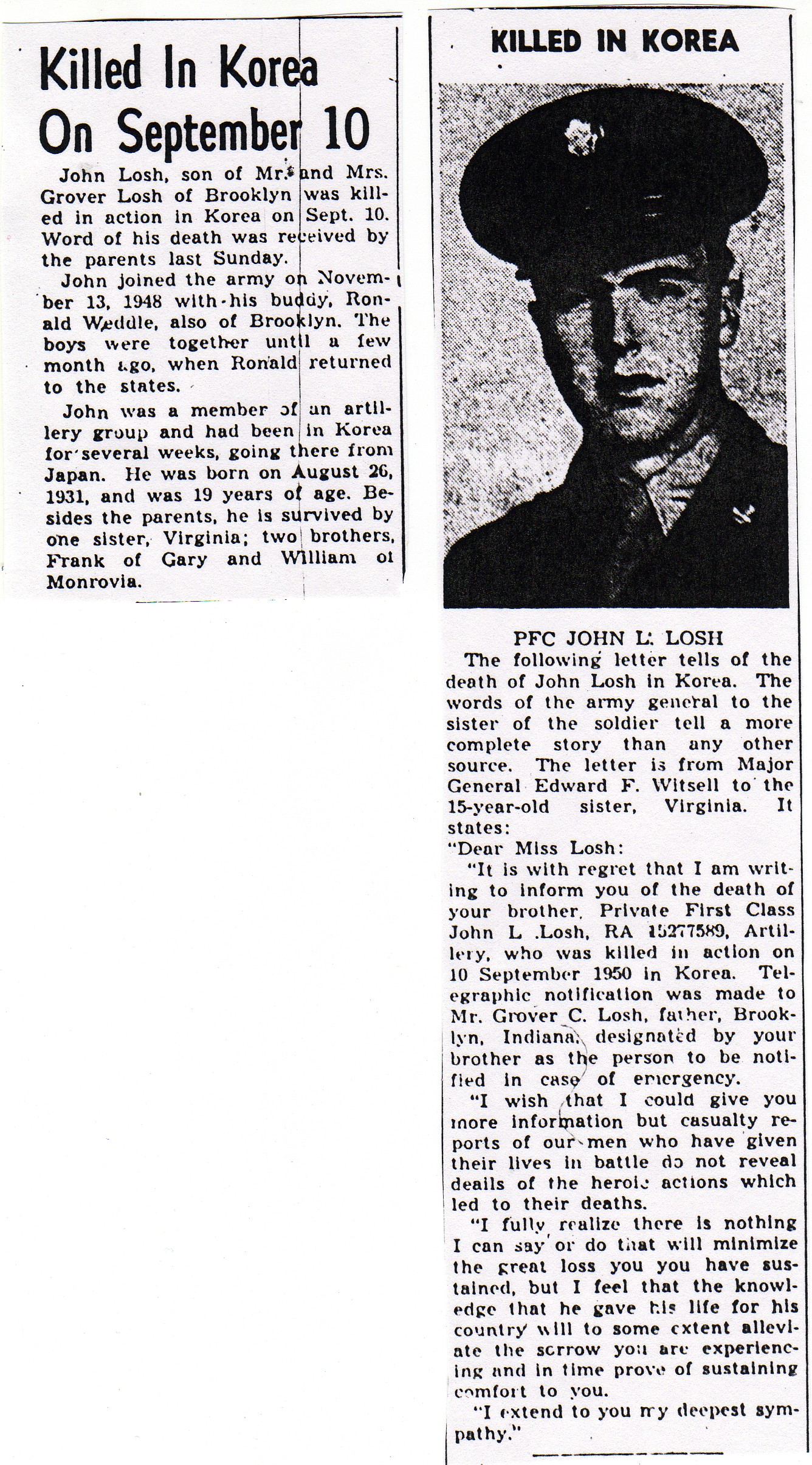 | Survived By | Parents, Mr. & Mrs. Grover Losh; sister, Virginia; brothers, Frank and William Losh. |