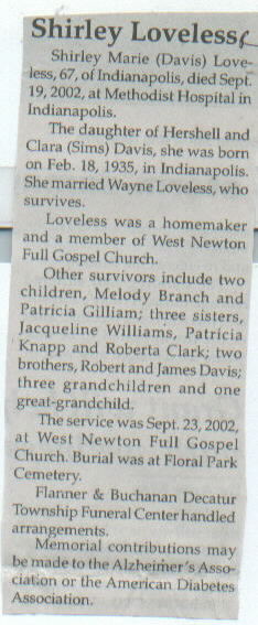 | Survived By | Spouse; 2 children, Melody Branch and Patricia Gilliam; 3 sisters, Jacqueline Williams, Patricia Knapp, and Roberta Clark; 2 brothers, Robert and James Davis; 3 grandchildren; one great-grandchild. |
