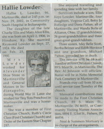 | Survived By | Son, Ellis Keys Lowder; 4 daughters, Virginia Call, Betty Jo Rutledge, Doris Patton, and Wanda Bolle; 12 grandchildren; 26 great-grandchildren; 3 great-great-grandchildren. |