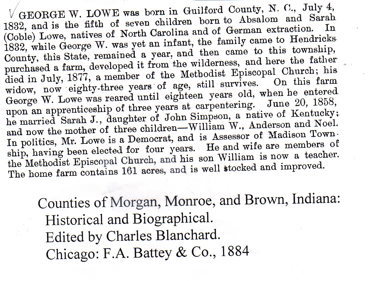| Other | Age 58. "Born in Guilford Co., N.C.; died at home in Madison Township, Morgan Co., Ind. Came to Indiana with his family in 1833. He married Sarah J. Swearengin." |