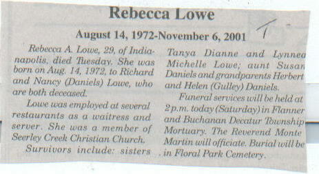 | Survived By | Sisters, Tanya Dianne and Lynnea Michelle Lowe; aunt, Susan Daniels; grandparents, Herbert and Helen (Gulley) Daniels. |