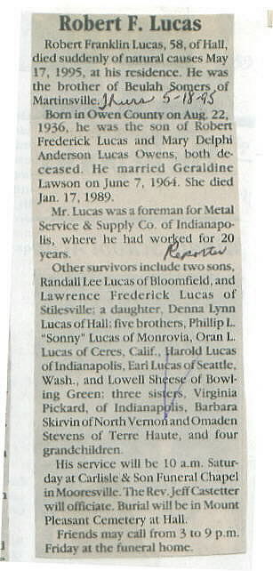 | Survived By | Sons, Randall Lee and Lawrence Frederick Lucas; daughter, Denna Lynn Lucas; brothers, Phillip L., Loran L., Harold, Earl, and Lowell Lucas; sisters, Virginia Pickard, Barbara Skirvin, and Omadea Stevens. |