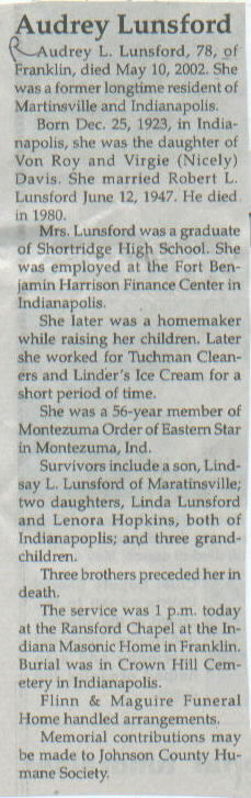 | Survived By | Son, Lindsay L. Lunsford; 2 daughters, Linda Lunsford and Lenora Hopkins; 3 grandchildren. |