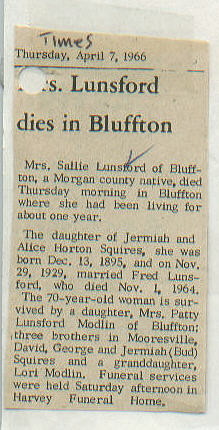 | Survived By | Daughter, Mrs. Patty Lunsford Modlin; 3 brothers. |