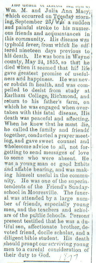 | Other | Age 22 years and 4 months. Parents: William M. and Gulia Ann Mills Macy. [From the Diary of Elam Harvey for Sept. 25, 1877: "Aaron M. Macy died this morning at 6 o'clock after three weeks sickness with Typhoid Fever. He was twenty one years old and one of the best of boys. He was industrious and good."] |