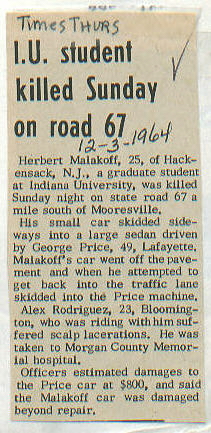 | Other | Age 25. Graduate student at IU. Killed in an auto accident on State Road 67, one mile south of Mooresville. |